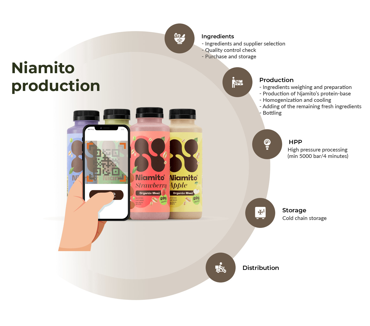 When crafting Njamito, we combined great taste and healthy ingredients with complete traceability. Through a QR code scan, consumers can follow Njamito’s journey from its raw ingredients, through production, HPP, and packaging, all the way to their hands.